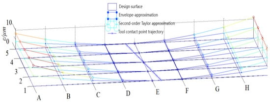 The analyses of Equations (4)–(9) show that the tool envelope determined by Equation (9) is described by the surface , the curve and the corresponding kinematic invariant parameters and of , which is tangent to the design surface along the tool contact trajectory curve. This makes it possible to model the optimization of the tool motion in relation to the workpiece without taking into account external factors, such as the specific structure of the machine tool, so that the tool envelope meets the predefined local structural requirements (interpolation conditions) with respect to the design surface along the tool contact point trajectory curve ; at the same time, the error of the tool envelope surface relative to the design surface is globally minimized in a wide range of regions beyond the tool contact point trajectory curve , thus achieving coordinated optimization of tool position planning from local to global. The following is discussed in the case that the envelope motion satisfies Equations (5)–(8): (1) If the parameter is set appropriately, the normal curvature of the tool surface envelope in the perpendicular () direction of the tangent to the tool contact point trajectory in the plane of common tangency between the tool surface and the design surface can also be made equal to the normal curvature of the design surface in the same direction, Combined with the condition that the tool envelope is tangent to the design surface along the tool contact point trajectory curve , we obtain the interpolation condition that the short-range deflection and normal curvature of the tool envelope and the design surface are equal at any point on the curve in any direction. (2) By adjusting the kinematic invariants and , the tool envelope error with respect to the design surface is minimized over a wide range beyond the tool contact point trajectory curve .