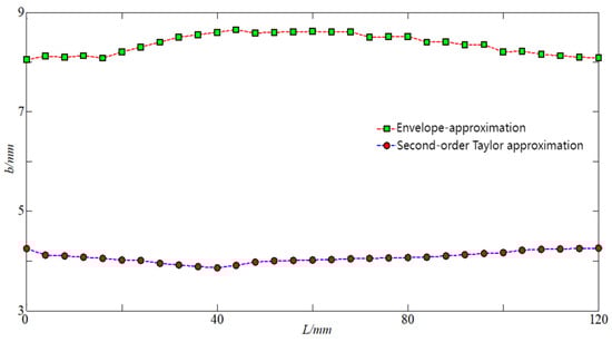 In comparison to second-order and third-order Taylor approximations, as well as traditional ball-end cutter approaches, the study reveals that when is 0.01, the bandwidth of the non-spherical cutter is 0.98, the second-order Taylor approximation’s bandwidth is 0.312, the third-order Taylor approximation’s bandwidth is 0.614, while the envelope approximation introduced in this paper achieves a bandwidth of 0.663. Similarly, at = 0.005, the bandwidths are 0.69, 0.248, 0.528, and 0.5827, respectively. Notably, the envelope approximation consistently demonstrates the widest bandwidth, indicating its potential to significantly enhance both the processing accuracy and efficiency, particularly in the machining of symmetrical workpieces.