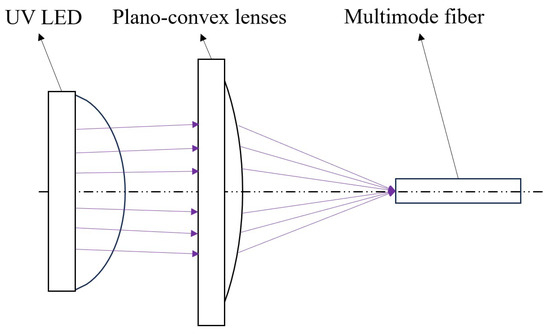 When UV light passes through the optical fiber, factors like mode field distribution cause a non-uniform light distribution at the fiber output, describable by a Gaussian or quasi-Gaussian distribution. In a Gaussian distribution [26], optical power is concentrated at the center of the light cone, and its power distribution is described as follows: