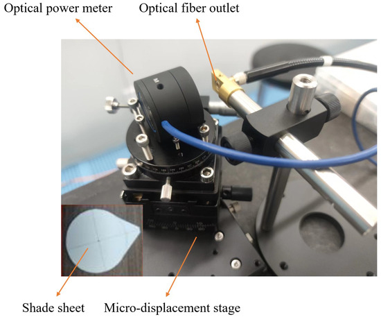 During the experiment, the fiber output was securely mounted on a bracket, while the optical power meter was positioned on a micro-positioning stage. A light-blocking plate with a precision aperture was placed directly in front of the fiber output, as illustrated in Figure 3. The UV LED was operated at an elevated power level, and the micro-positioning stage was adjusted to laterally translate the optical power meter, thereby determining the radial distance at which the optical power reaches .
