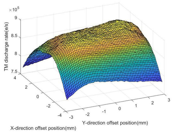 When the TM position is shifted to (X = +0.8 mm, Y = +1.8 mm), the discharge rate of the TM reaches a maximum of approximately ; when the TM position is shifted to (X = +4 mm, Y = −2.9 mm), the discharge rate of the TM reaches a minimum of only . The difference between the maximum and minimum discharge rates can reach 15%. However, during normal operation of the inertial sensor, the TM’s deviation from the center position usually does not reach such a large extent. Within an interval of 0.1 mm, displacement of the TM position does not significantly affect the performance of the charge management system.