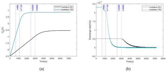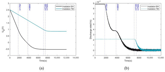 As shown in Figure 8a, when the TM carries a negative charge and is irradiated, its surface potential reaches an equilibrium state after 2500 s, with an equilibrium potential of approximately 0.85 V. In Figure 8b, before 680 s, the potential difference is less than −0.98 V, corresponding to state , with a discharge rate of 2.3 mV/s. At 680 s, the potential difference exceeds −0.98 V, corresponding to state , and the discharge rate of the TM begins to decline. At 1130 s, the potential difference reaches 0 V, and the charging and discharging of the TM are not inhibited. At this time, the number of electrons flowing from the TM to the EH and from the EH to the TM per unit time both reach their maximum, with the TM discharging at a rate of 2.1 mV/s. After 1130 s, the potential difference becomes greater than 0 V, corresponding to state , causing the discharge rate to gradually decrease until around 2500 s, when the electron flow between the TM and the EH is balanced and the TM reaches equilibrium potential.