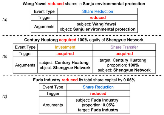 Event extraction (EE) is a fundamental yet challenging research task in the field of information extraction. It is widely applied in areas such as information retrieval [1,2,3], intelligent question answering [4,5,6], social event detection [7,8,9], and recommendation systems [10,11,12]. The goal of EE is to automatically identify structured information such as event types, triggers, and arguments from a given unstructured text. Early research works [13,14,15,16,17,18] mainly focus on non-overlapping event extraction as shown in Figure 1a. The event “Share Reduction” is triggered by the trigger “reduced”. The event includes the arguments “Wang Yawei” and “Sanju Environmental Protection”, which serve as the “subject” and “object” argument roles, respectively.