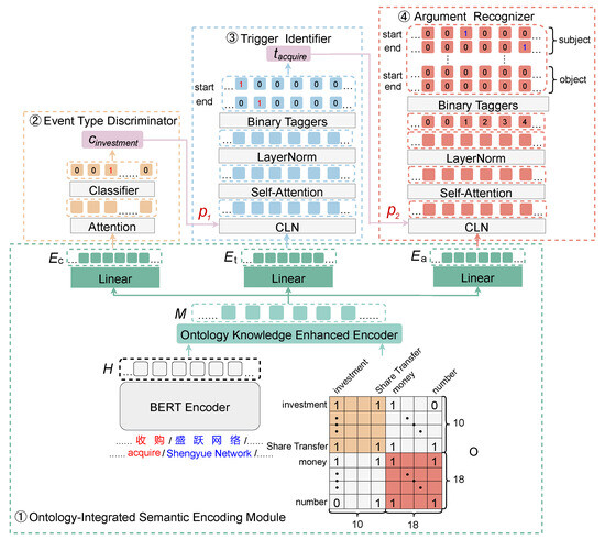 The overlapping event extraction model OGSS we proposed consists of four main functional modules: ontology-integrated encoding, event type discrimination, trigger identification, and argument recognition. The overall structure of the model is shown in Figure 2. First, we design a symmetric matrix for event ontology knowledge representation and integrate it into the semantic encoding process. Then, we further process the semantic encoding based on the characteristics of extraction targets such as event types, triggers, and arguments, obtaining semantic representations tailored for each subtask. Finally, we input the semantic representations into each subtask and sequentially perform the extraction of event types, triggers, and arguments within a joint framework.