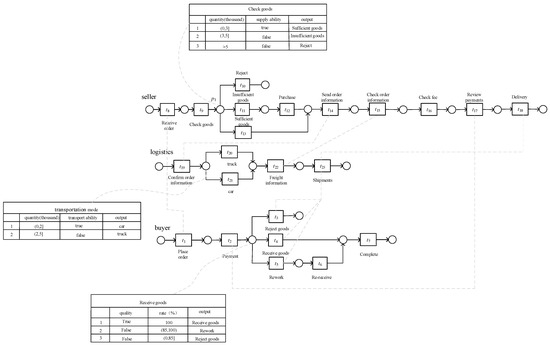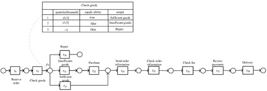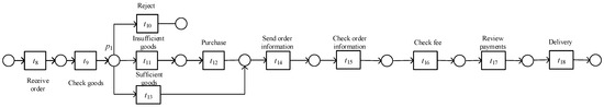 Data are crucial for the operation of the processes. If we only consider the control flow of the process and ignore the data, it may lead to premature termination, incorrect route selection, deadlocks, and so on. Figure 1 shows a seller’s sales process. Figure 1 is a real-life process design about the seller’s sales process, which is independent of event logs. If there are real-life logs, they can be mined using mining tools. The common mining algorithms include the algorithm [29], heuristic mining algorithm [30], genetic process mining [31], inductive mining [32], etc. The process begins with receiving the order and then checking the goods. There are three options, namely direct rejection, insufficient goods, and sufficient goods, and subsequent activities include sending order information, checking order information, checking the fee, checking payments, and delivery.