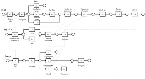 1. In the first trace, a decrease of 1000 units: After t9 occurs, the quantity is still deemed sufficient. The order information is then sent to logistics. Due to the decrease in quantity, the transportation mode changes according to Figure 4, resulting in a change in freight. The seller then rechecks the fees. In this trace, the expected behaviors of t9 are {t13, t14, t16}, all of which satisfy the rule for a quantity less than 3000 units. Therefore, the effective expected behaviors are the same as the expected behaviors.
