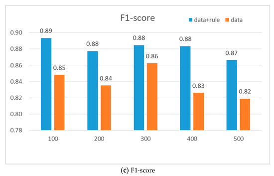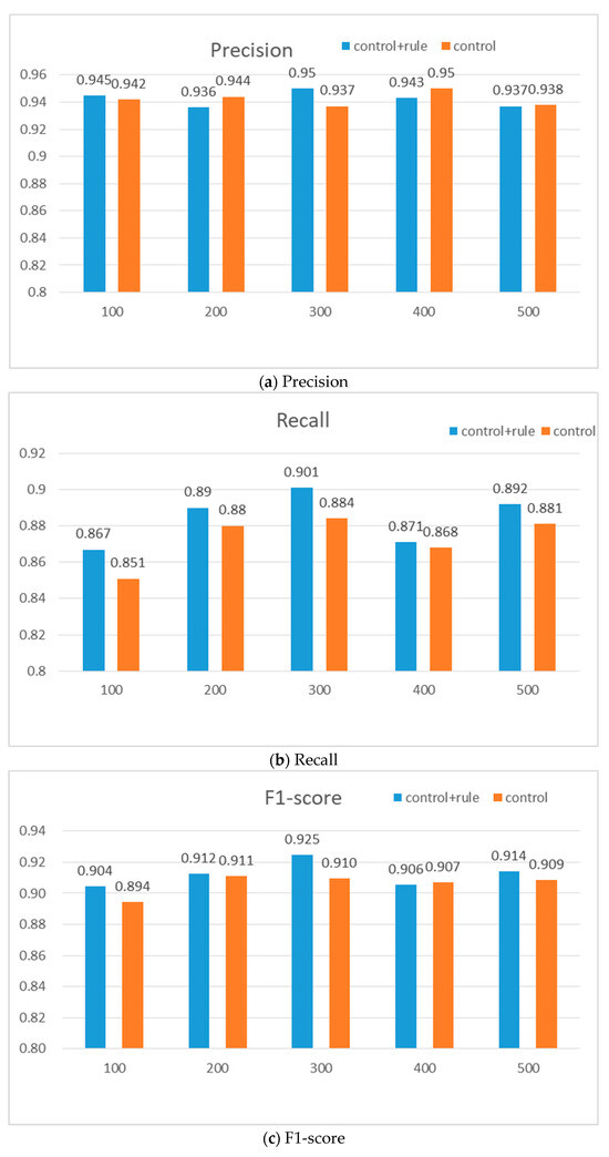 From Figure 5, it can be seen that when the control flow changes, considering the rule constraints is generally better than not considering the rule constraints in terms of recall and F1-score, which indicates that considering the rule constraints is more comprehensive in identifying the effective expected behavior, and performs better in balancing accuracy and recall. Not considering rule constraints is close in accuracy to considering rule constraints, and even slightly higher in the first four points, but slightly lower in recall and F1-score than considering rule constraints. Therefore, the impact of rule constraints on the effectiveness of expected behavior is not great, but most of them are better than those without considering rule constraints.