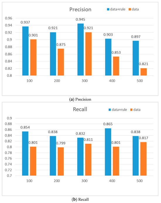 As can be seen from Figure 6, when the data value changes, in terms of accuracy, the average accuracy of the effective expected behavior considering the rule constraints is improved by about 4.7%, reaching a peak at 0.945, which means that the accuracy of the effectiveness of the obtained expected behavior is relatively high. The overall accuracy without considering the rule constraints is lower than that when considering the rule constraints. The lower accuracy may mean that there are more false positives when judging as positive, that is, the expected behavior that is not effective originally is judged as effective, which affects the reliability of the results. In terms of recall, the average recall of effective expected behavior increased by about 4% when considering the rule constraints, and the peak value reached 0.865. This indicates that the actual effective expected behavior can be found more effectively, and the situation of missing detection is reduced. The recall without considering the rule constraint is lower than that with considering the rule constraint. A lower recall may mean that not all positive samples are fully identified, and there are more false negatives. In terms of F1-score, the average F1-score of effective expected behavior is increased by 4.3% when considering the rule constraints, indicating the comprehensive performance of precision and recall is better. The increase in F1-score shows that the rule constraint not only improves the accuracy and recall, but also maintains the balance between them. The F1-score of the method without considering the rule constraint is generally lower than that of the method when considering the rule constraint. The lower F1-score indicates that the balance between precision and recall is poor, and that the comprehensive performance is weak without considering the rule constraint. Therefore, when analyzing the impact of data changes on the process, rule constraints should be considered to avoid identifying abnormal behavior as effective expected behaviors, thus reducing the false negative rate of effective expected behaviors and laying a foundation for the consistency analysis of event logs and models in the future.