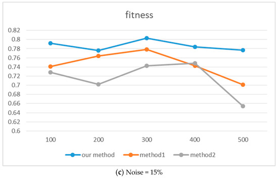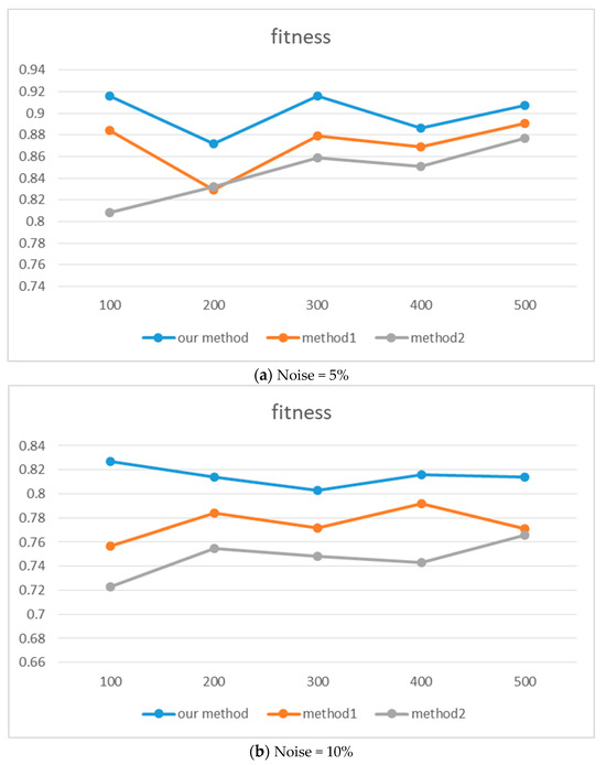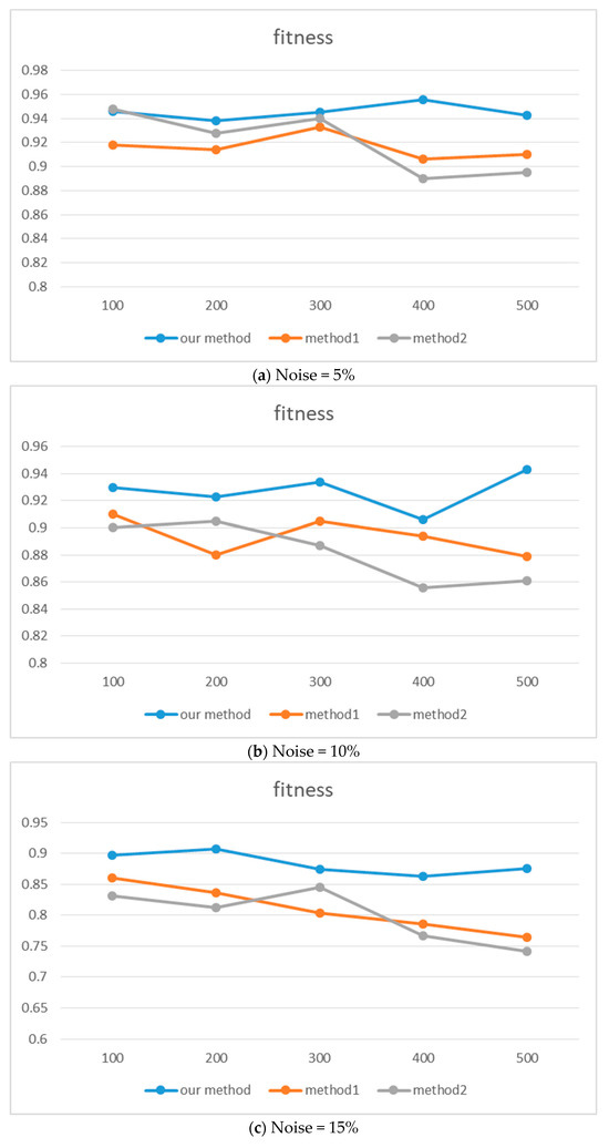 When comparing the consistency calculation method proposed in this paper (hereinafter referred to as “our method”) with the existing method1 and method2, we use fitness as the evaluation index and make a systematic analysis based on the experimental results in Figure 7 and Figure 8 and Table 3. Specifically, when faced with different levels of noise interference (5%, 10%, and 15%, respectively), the performance of the new method shows good robustness. In a 5% noise environment, compared with the method1, the average fitness of our method is improved by about 2.94% and 2.9% on the artificial and real event logs, respectively. Compared with method2, the growth rates are about 2.54% and 5.4%, respectively. This result preliminarily verifies the effectiveness of the new method in dealing with slight data disturbances. With the noise level increasing to 10%, compared with method1, the average fitness on artificial and real event logs is further improved by about 3.3% and 3.96%, respectively. Compared with method2, the improvement is about 3.96% and 6.78%, respectively. When the noise level reaches a high level of 15%, compared with method1, the average fitness of our method in artificial and real event logs is improved by about 7.3% and 8.3%, respectively. Even compared with method2, significant increases of about 4.5% and 7.1% were achieved, respectively. Based on the above data, it shows that our method has good robustness and adaptability under different noise conditions, and its overall adaptability is relatively stable. Although there is slight fluctuation, its overall performance is better than the other two methods, indicating that this method has good noise resistance and adaptability.