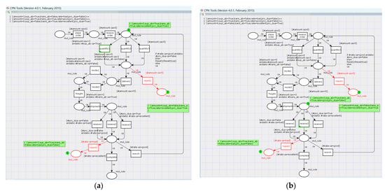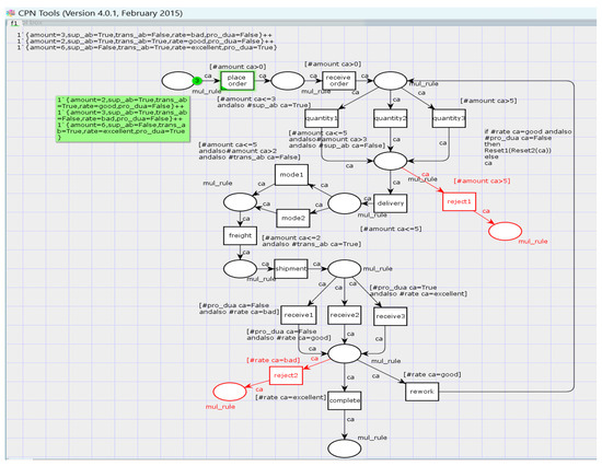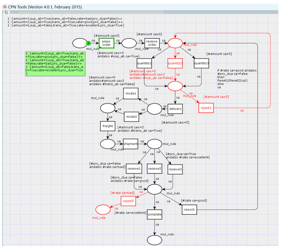 In addition, in order to show the impact of data changes, the change propagation process of the collaborative process is simulated based on CPN Tools. Figure 9 corresponds to the collaboration process with the decision analysis table in Figure 4, and the black part represents the basic collaboration process, including the control flow, data elements, and transition guards, where the decision analysis table in Figure 4 is transformed into transition guards in Figure 4. The green part represents the initial mark, and the model must contain the green part in order to run. For processes that contain data elements and complex rule constraints, there may be some defects, and the red part indicates the defect status under the initial marking.