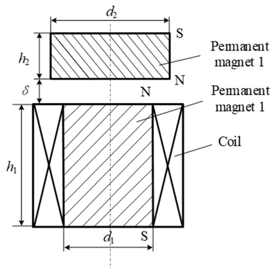 Permanent magnet 2 is a movable part with a maximum displacement of 20 mm and its air gap δ0 = 20 mm relative to permanent magnet 1 in the starting position. The dimensional parameters in the simulation model are listed in Table 1. The characteristic parameters of the simulation model are listed in Table 2.