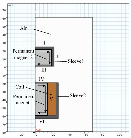 The electromagnetic field and the electromagnetic force of the electromagnetic device are analyzed using finite element simulation software COMSOL5.5, and a two-dimensional axisymmetric model for magnetic field analysis of the electromagnetic device is established [24]. As shown in Figure 3, the rectangular blocks on the left side above and below in the figure represent two permanent magnets, respectively, while the rectangular block on the right side of permanent magnet 1 is the coil area, and the two L-shaped areas are the sleeves, and the permanent magnets are all N48 powerful neodymium-iron-boron magnets, and the material of the coil is copper, the material of the sleeve is 304 stainless steel, and the other parts are air domains. In addition, regions I–VI and the direction of the arrow in the figure are the set paths for extracting the results of the magnetic induction strength simulation.