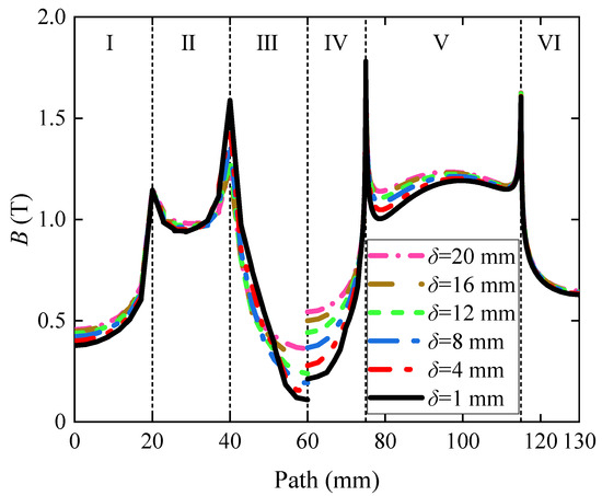 As shown in Figure 6, the magnetic induction intensity varies with the paths I-VI marked in Figure 3. It can be seen that the magnetic induction intensity reaches its peak at the location where the structural shape changes, and gradually increases in the direction of the arrow in regions I and IV, and gradually decreases in regions III and VI. In the area of II and V, that is, on the side of the permanent magnets 1 and 2, the magnetic induction shows the properties of the two ends of the large one in the middle of the small one, since the magnetic lines of force of the permanent magnets are converged from the two poles, which leads to this that the magnetic induction intensity increases at both ends of the permanent magnets. Since the magnetic field of the permanent magnet at the intersection of paths IV and V and the magnetic field generated by the coil overlap most strongly, the magnetic induction strength of permanent magnet 2 is also greatest at this position. The trend in the magnetic induction intensity of the two permanent magnets with the direction of the path arrows under different air gaps δ is close to the trend, but there is a numerical difference, and the maximum value of the magnetic induction intensity of the permanent magnets increases as the air gap δ decreases from 20 mm to 1 mm from 1.67 T to 1.78 T. The magnetic induction intensity of the two permanent magnets with different air gap δ is close to the trend in the path arrow direction, but there is a numerical difference.