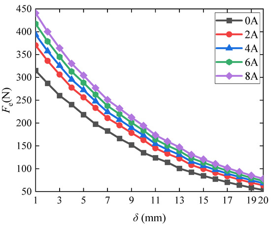 Figure 7 shows the variation in the electromagnetic force with the air gap δ for different currents. As the input current increases, the electromagnetic force becomes larger, and the curve trend is more pronounced in the air gap δ is located in the range of 1–10 mm, this is due to the air has a large magnetoresistance, when the magnetic line of force in the air through the attenuation of the large, so the larger the air gap, the electromagnetic force due to the large magnetoresistance, the large loss and become smaller.