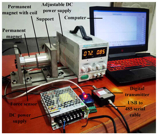 Figure 8 shows the constructed electromagnetic force test device. Two permanent magnets are fixed to the base by means of brackets. The air gap δ is varied by adjusting the distance between the brackets. Coils are wrapped around the permanent magnets 1, the input current to the coils can be varied by an adjustable DC power, and the electromagnetic force between the two permanent magnets can be fed to a computer using a force sensor, a digital transmitter, and a USB-485 serial cable.