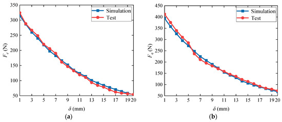 Figure 9 shows the comparison between the test results and the simulation results of the electromagnetic force acting on permanent magnet 2 with different air gaps at 0 A and 4 A coil current. As can be seen in the figure, the variation in the electromagnetic force with air gap obtained from the test is close to the simulation results. The maximum relative error between the two is 3.57%. The validity of the results of the analysis of electromagnetic fields is verified.