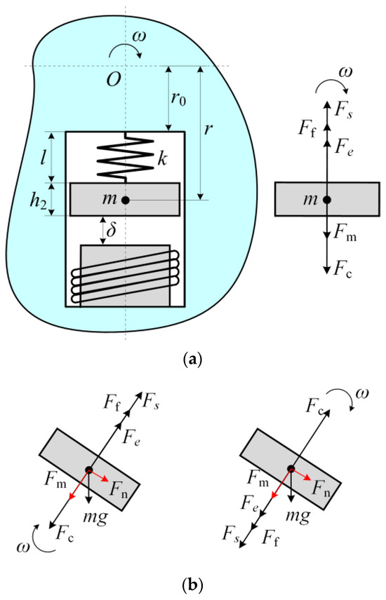 When the DMF works, permanent magnet 2 and the sleeve can slide along the radial slot of the primary flywheel. The mechanical analysis of permanent magnets 2 and sleeves in a single electromagnetic device is investigated. As shown in Figure 10, point O is the rotational center. In the mechanical analysis, permanent magnet 2 and the sleeve are considered as a whole (a moving part), and the mass is m. The stiffness and initial length of the spring are k and l0. The distance from the spring attached to the primary flywheel to point O is r0. The distance from point O to the center of mass of the moving part is r. ω is the DMF rotational angular velocity.