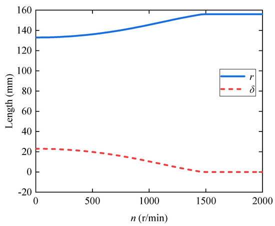 In the electromagnetic device, the mass of the moving mass is m = 0.3 kg, the stiffness of the spring is k = 30 N/mm, r0 = 90 mm, l0 = 36 mm. The variation curves of the spring deflecton Δl, the distance r from the center of mass of permanent magnet 2 to the point O of the slewing center, and the size of the air gap δ at different rotational speeds for the input current I = 4 A are obtained and shown in Figure 12 and Figure 13.