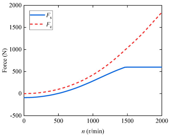 Figure 14 shows the curves of the spring force Fs on permanent magnet 2 and the centrifugal force Fc of permanent magnet 2 as a function of rotational speed. Due to the electromagnetic force, the centrifugal force is 0 N and the spring force is −73 N at a speed of 0 r/min, when the spring is in compression. As the rotational speed continues to rise, the centrifugal force of permanent magnet 2 and the spring force by which it is acted upon increase gradually, when the rotational speed is increased to 500 r/min, the spring force is 0 N. When the rotational speed is 1487 r/min, the spring force reaches a maximum value of 600 N. Thereafter, as the rotational speed is increased, the spring force is no longer changed and the centrifugal force continues to increase.