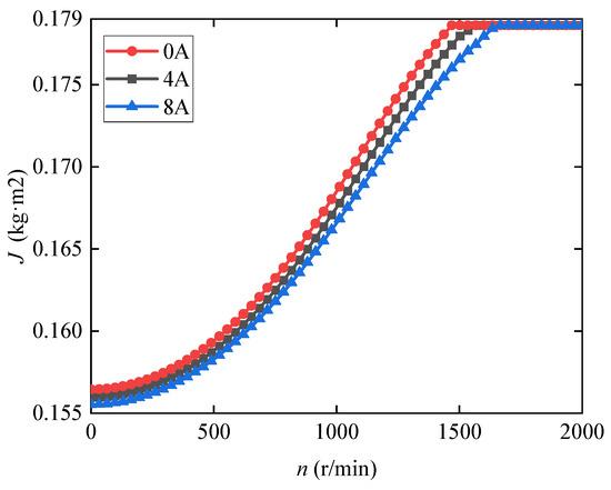 Since the intrinsic frequency of the system is directly related to the moment of inertia of each degree of freedom, the moment of inertia of J1 increases after the introduction of the electromagnetic device, and the value of the increased moment of inertia, J, varies at different rotational speeds, as shown in Figure 16. Therefore, the first- and second-order resonant frequencies f1 and f2 of the system change with the rotational speed, as shown in Figure 18. As the rotational speed increases, the first- and second-order resonant frequencies f1 and f2 of the system are decreasing. This allows the engine to run at lower idle speeds, which can reduce energy consumption. It can also be noticed that the current has less effect on the frequency characteristics at low speeds, while the frequency sensitivity to the current magnitude increases as the speed increases.
