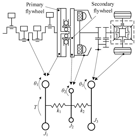 Since the noise and vibration of the automotive driveline mainly occur when the engine starts and operates at high speeds, the driveline model equipped with a variable inertia DMF is simplified to analyze the low-order and high-order intrinsic frequencies of the automotive driveline. An equivalent model of the driveline dynamics is shown in Figure 17, where J1 is the sum of the moment of inertia of the engine crankshaft and the primary flywheel, J2 is the moment of inertia of the secondary flywheel of the DMF and the clutch disc, J3 is the equivalent moment of inertia of the driveline, K1 is the average torsional stiffness of the DMF, and K2 is the equivalent torsional stiffness of the driveline.