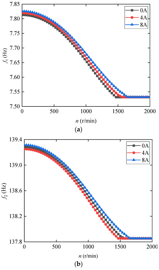 The variation in resonance frequency with speed at different currents. (a) The variation in f1 with rotational speed. (b) The variation in f2 with rotational speed.