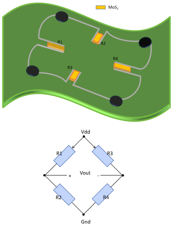 In this paper, the integration of a fully symmetrical Wheatstone bridge structure with a flexible piezoresistive pressure sensor based on MoS2 and PDMS substrate is proposed, showing superior sensitivity. The paper is organized as follows: In the first section, the research background and the significance of the PDMS + MoS2 flexible sensor are introduced, along with an overview of current research trends. In the second part, the piezoresistive effect of the designed flexible sensor is analyzed. The sensor’s manufacturing process is reported. In the third section, the piezoresistive effect of the MoS2 film on PDMS is simulated. The impact of the cavity structure on the sensor’s sensitivity is investigated. A circuit-level simulation model of the fully symmetrical Wheatstone bridge structure is developed to verify the zero offset effect resulting from the resistance asymmetry caused by process deviations during preparation. In the fourth part, the conclusions are summarized.