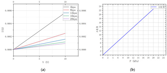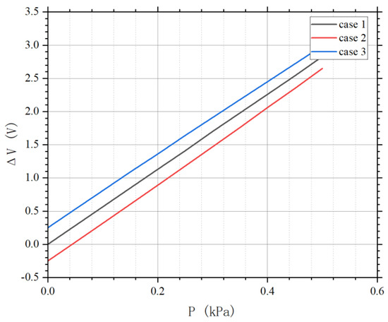 Figure 13 shows the influences of the process variations on the sensor’s voltage output. It can be confirmed that variations in manufacturing processes and piezoresistive coefficients lead to resistance asymmetry and zero-point offset in the Wheatstone bridge structure. This offset results in an output voltage even without applied pressure. Moreover, it can also be observed that the trend of the sensor output voltage remains the same. A proportional relationship can be observed, showing good linearity of the sensor’s output.