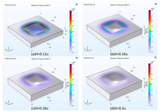 Figure 10 illustrates how stress varies with the different thickness of PDMS. Firstly, regardless of PDMS thickness, the cavity structure can amplify the pressure at its edges. If MoS