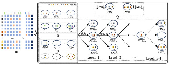 [26,27]. Let and let a nested attribute set sequence satisfy , where is the set of condition attributes and is a subset of condition attributes. Let be the set of decision classes and let be a subset of decision classes under the multi-level granularity structure . The positive, boundary, and negative regions of the with respect to the threshold pair are defined follows: