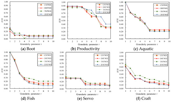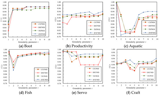 From Figure 2, the trends of TSTWD and CSTWD exhibit similar behavior when . However, when , the CCA curves of IFSTWD on the Boot and Productivity datasets show slower changes compared to the other datasets. At , the CCA of IFSTWD is significantly higher than the other three methods. Finally, when , all four methods reach a steady state on the Boot, Aquatic, and Fish datasets. On the Servo dataset, all three methods reach a steady state, except for DSTWD. Similarly, Figure 3 illustrates that the ECR curves for different methods decrease as increases. When approaches 10, the ECR curves for the other five datasets gradually converge, with the exception of the Productivity dataset. In addition, the ECR curves of Boot and Servo decline relatively slowly. When , the ECR curves of IFSTWD and DSTWD are similar to those of Productivity, Fish, Servo, and Craft. However, at , the ECR curves of Boot, Aquatic, and Servo tend to be similar under four different particle size partitioning methods. When , the ECR curves of IFSTWD are the lowest in Boot, Aquatic, Fish, Serv and Craft, and the ECR curves of the other four datasets are significantly lower than those of the other three methods, except for the Aquatic dataset. On the Aquatic dataset, the ECR curves of IFSTWD and TSTWD are the lowest. In summary, the CCA curves of the four methods on the six datasets gradually increase with the increase of t, while the ECR curves are the opposite. The performance of the proposed IFSTWD model surpasses the other three methods, as demonstrated by the CCA curve, which shows a steady improvement as the particle size parameter increases.
