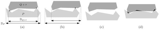 For and 3, the optimal stacking under the first scoring criterion minimizes the height of the container enclosing the stacking, making it applicable in the field of logistics, where optimal packing is necessary. Under the second and third scoring criteria, the optimal stacking minimizes the “gap” between P and Q, which can be utilized for optimal occlusion in dentistry []. Additionally, we expect that the optimal stacking for dimensions can be utilized to measure the similarity of data, defined by piecewise linear functions in high-dimensional spaces.
