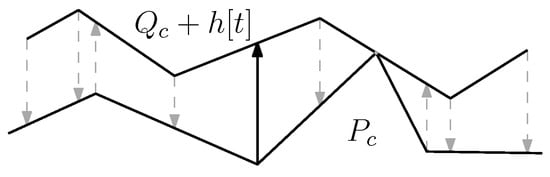 When is placed on top of P for , measures the maximum pointwise vertical distance between and , which is realized by a vertex–edge pair , where and , or vice versa. See Figure 3 as an example.