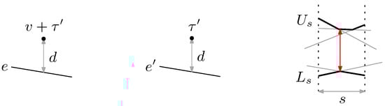 For each interval s of , we find a vector that minimizes . For a vertex–edge pair where and , the set of all vectors is such that forms a segment . Moreover, for any vector lying above , also lies above e and the vertical distance between and is the same as the vertical distance between and e. See Figure 4. Similarly, for a vertex–edge pair where and , any vector lying above makes v lie below , and the vertical distance between and is the same as the vertical distance between v and .