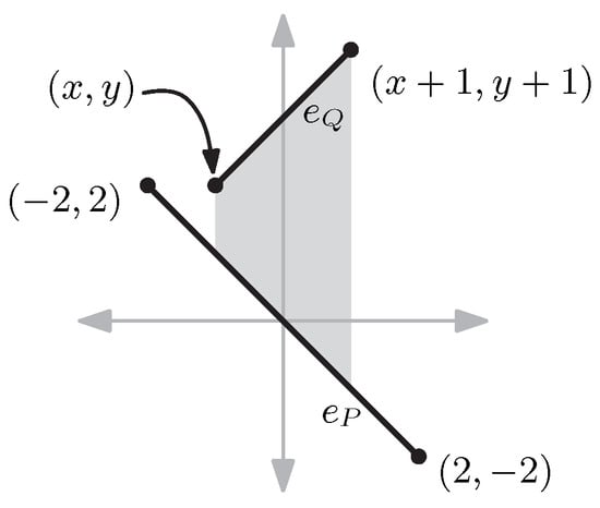 For a vector , let be the vertical line passing through t. From the construction of C, a point in corresponds to a vertex–edge pair or such that or . So, if Q is translated by for a real , lies below , or lies above .