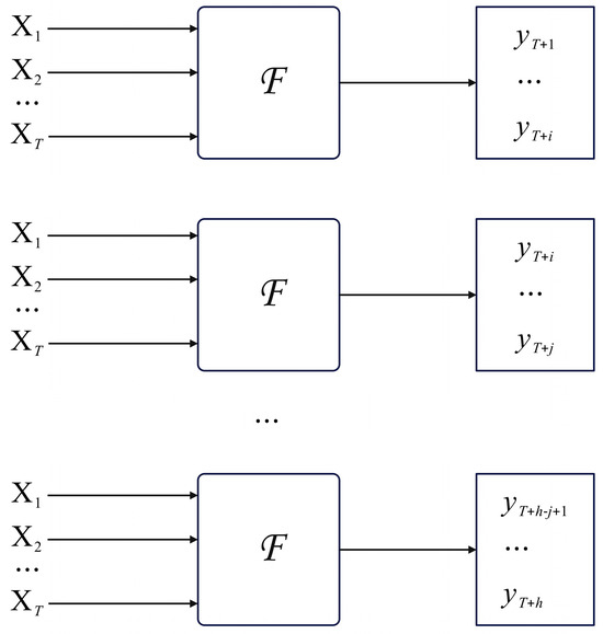 where the parameter matrices and map the new features to dimension T. The final prediction is generated using the linear transformations and . The final prediction results use a modified hybrid strategy with the same model, which accepts multiple inputs and predicts multiple outputs. This strategy balances the drawbacks of direct, iterative, and MIMO strategies, avoids conditional independence assumptions, and allows for time dependence between the output data, while the simultaneous outputs of multiple models allow some flexibility. Figure 3 illustrates the architecture of the improved hybrid strategy proposed in this chapter, where F denotes the trajectory prediction model proposed.