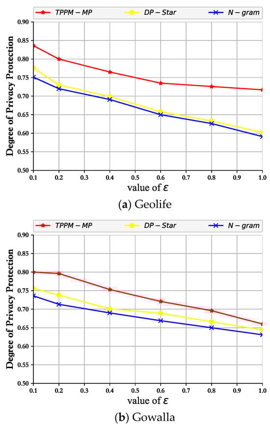 In this example, the degree of privacy protection is regulated and controlled according to the privacy budget of DP, and the distance between the actual location and the pseudo location is obtained from the probability as . To facilitate the measurement of the degree of privacy protection, the result is restricted to [0,1], so the formula for the privacy protection degree (PPD) is . The results obtained using the comparative experimental real-world datasets Geolife and Gowalla are shown in Figure 4.