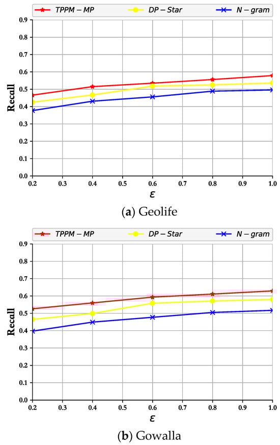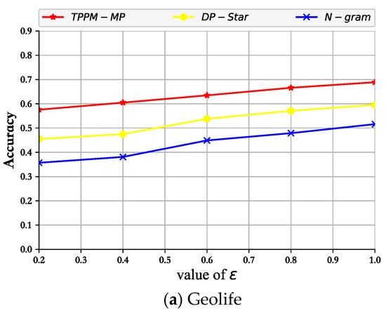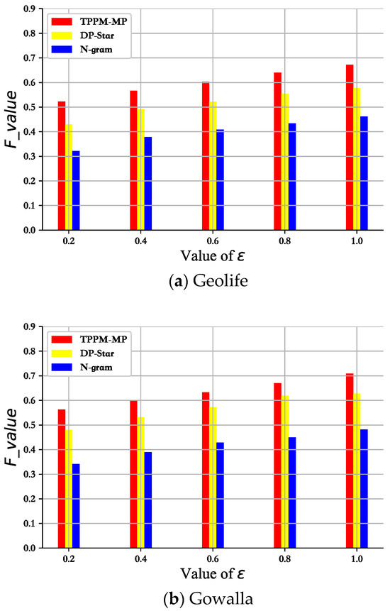 As shown in Figure 5, Figure 6 and Figure 7, the experimental results of TPPM-MP, N-gram, and DP-Star under different privacy budgets were assessed. Firstly, analyzing the curve shapes, that obtained via our mechanism was similar to those of the previously proposed mechanisms. Throughout the experimental results, the values of the three metric mechanisms, precision, recall, and F-value, all increased with epsilon. This is mainly because our privacy-preserving mechanism is less tolerant of noise; therefore, when epsilon increased, it added a small amount of noise. This was also the reason why the data availability could be better realized. In addition, our approach had more outstanding performance metrics than the other two schemes, mainly because our privacy budget allocation mechanism and noise control output mechanism played a good role in ensuring that the published pseudo-trajectory data was highly similar to the actual trajectory data.