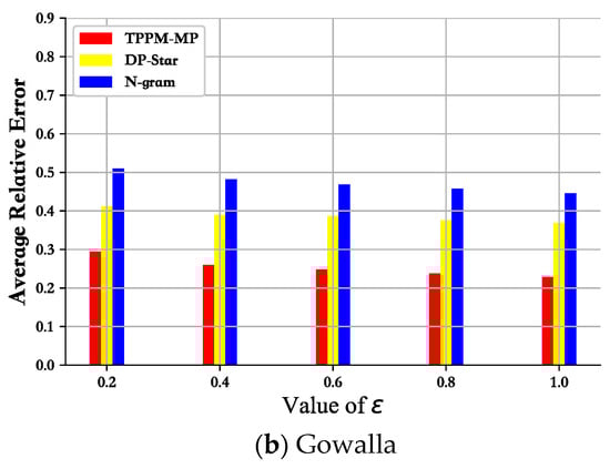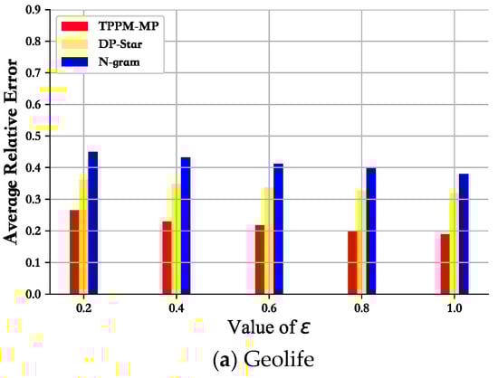 The N-gram method first extracts the sensitive information in the trajectory data using a variable-length n-gram model. Then, it adds noise adaptively for each data in the trajectory sequence. This scheme adds too much noise data compared to our DPTP-LICD scheme, resulting in a significant difference between the generalized output trajectory data and the original trajectory. DP-Star also provides excellent control over the privacy budget compared with our mechanism but applies the minimal description principle to generalize the original trajectory sequence into a series of points that are representative of the trajectory. While this saves storage space and reduces budget allocation, it also guarantees the accuracy of some queries. However, this approach also makes the trajectory data more different from the original trajectory. In order to reflect the fairness and impartiality of the performance comparison experiment, we did not use the best p-value for the comparison experiment but used the average relative error to make the comparison, reconciling good p-values and bad p-values, so that the comparison experiment was closer to the fact and more objective. Especially as seen in Figure 8, we were able to achieve a relatively low average relative error with increasing privacy budget via DPTP-LICD compared with N-gram and DP-Star.