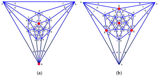 For TOP6, the corners of the valency 5 nodes are arbitrary and mapped as in Figure 2a. The corners of the valency 6 nodes must then alternate between A and B (Figure 2a).