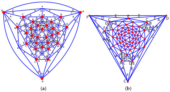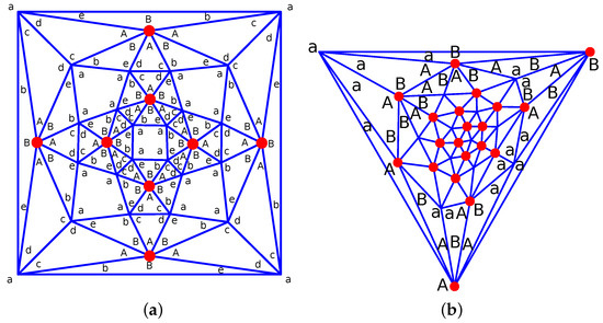 In what follows, we denote by and the numbers of edges of the faces belonging to families 1 and 2, respectively. When a polygon with P edges has n neighbors, its has edges that must be distributed between the n edges adjacent to neighbor faces. If we use the labels a, b, c, d, and e, to label the numbers of edges given to each hole by the first family of faces and A, B, C, D, E, and F for the second family, we have the following: