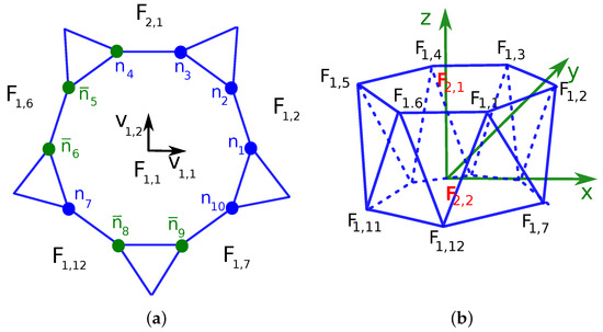 The nodes of the reference face of type 1 shared with the adjacent faces are (Figure 4a,b).