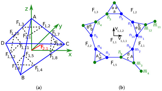 Parametrization of the icosidodecahedron with a pyramid on the pentagonal faces’ p-cage. (a) Icosidodecahedron vectors. (b) Mapping of vertices.