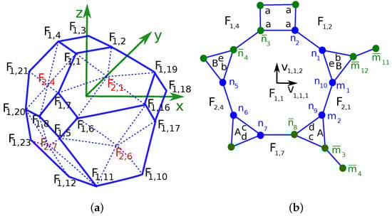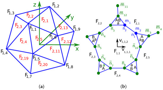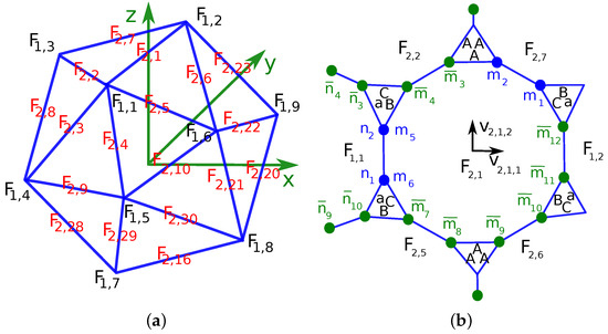 Parametrization of the Pentakis dodecahedron PD p-cage. (a) Pentakis dodecahedron vectors. (b) Mapping of vertices.