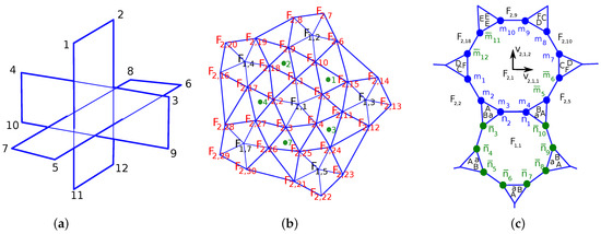 Parametrization of the cage built on a snub dodecahedron with pyramids on the pentagons’ p-cage. (a) Dodecahedron node numbering. (b) Partial face labeling. The green dots correspond to the vectors . (c) Mapping of vertices.