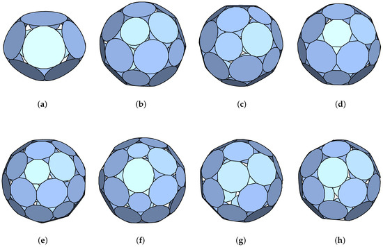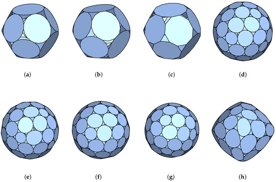 The TTP6 p-cages are made out of respectively 12 and 4 faces of types 1 and 2. The p-cages TTP6_P20_P24_5x3-6x3, TTP6_P15_P18_5x2-6x2, and TTP6_P10_P12_5x1-6x1 all have a similar structure with the respective deformations , , , , , and (Figure 11a–c).