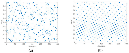 where mod is the remainder function. The distribution results of the initial particles obtained by the circular mapping and the random way are shown in Figure 1.