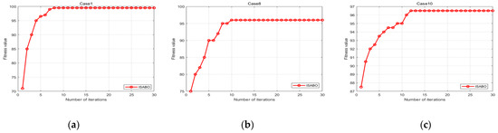 Case 6 to Case 10 in Table 5 are multi-section fault simulations, while the simulation results for Case 8 and Case 10 after randomization are shown in Figure 5b,c. In Case 8, Section 3 and Section 16 are faulty, and the information on nodes eight and thirty-one is distorted. The information reported using the FTU equipment is [1,1,1,0,0,−1,−1,0,−1,1,1,1,1,1,1,1,−1,0,0,0,−1,−1,−1,−1,−1,−1,−1,0,0,0,1,0,0]. The output positioning results are in Section 3 and Section 16, and the positioning results are correct. At the same time, the ISABO algorithm can also correctly locate the fault location in several other multi-section fault cases. The multi-section fault location experiment shows that in the case of DG access change, FTU signal distortion, etc., the location algorithm can accurately locate multiple faults, has high stability, and can cope well with complex working conditions.