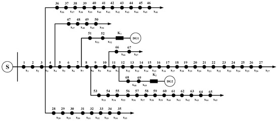 To demonstrate the proposed method’s effectiveness and scalability, this study conducts effectiveness analysis experiments in a larger-scale distribution network test system with integrated DGs. The specific topology of the test system is shown in Figure 6, which contains a total of 69 nodes and two DGs. On this basis, various simulation cases are designed, which fully consider DG’s dynamic access, removal operation, and complex scenarios such as single-point fault, multi-point fault, and information distortion. The results of 40 simulation experiments of the ISABO algorithm in each case are shown in Table 6.