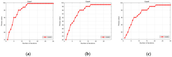 As shown in Table 5, Case 1 to Case 5 are single-section fault simulations. When a fault occurs in feeder Section 15 in Case1, the fault current information uploaded by the FTU is coded as [1,−1,0,0,0,−1,−1,−1,−1,1,1,1,1,1,1,−1,−1,0,0,0,−1,−1,−1,−1,−1,−1,−1,0,0,0,0,0,0]; forty tests are performed for this type of faults, and the localization results obtained are all for Section 15. The results of a randomized test are shown in Figure 5a. Similarly, the Case 2 to Case 5 tests also yielded correct localization results. In addition, the ISABO’s average number of iterations is always within 10 in the single fault case. The simulation results show that the ISABO can still locate the faults accurately and quickly under the changing DG access situation and FTU signal distortion.